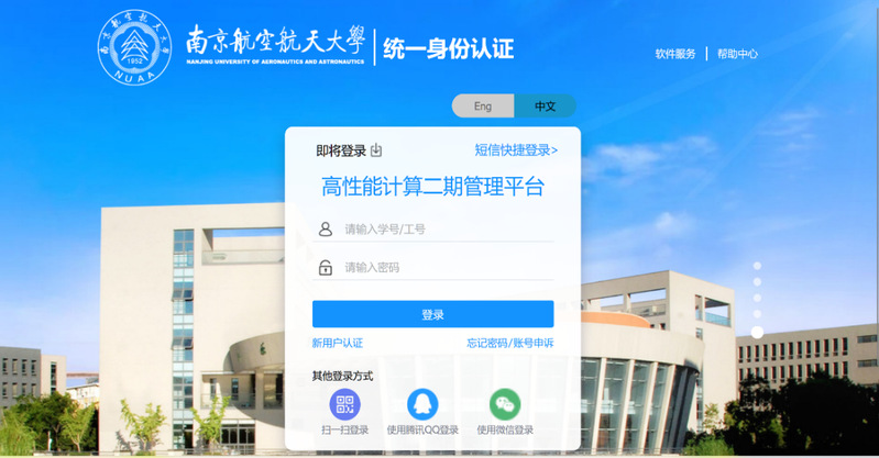 打开浏览器,输入https://hpcpt2.nuaa.edu.cn进入登录入口,校外人员通过管理员提供的账户密码从图7页面入口登录,校内人员点击右下角统一身份认证入口统一身份认证账户密码登录,如图1所示。