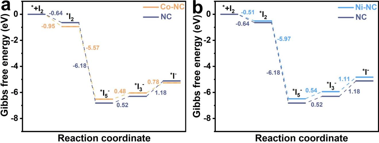 本研究全面探究了铁、钴、镍掺杂的多孔碳作为载体制备负载碘的正极, 密度泛函计算结果表明Fe-NC、Co-NC、Ni-NC 模型对I3−/I5−结合能强于 NC;Fe-NC 与I3−结合能为 - 0.90 eV(NC 为 - 0.39 eV);碘还原反应中,Fe-NC 决速步能垒 0.57 eV(NC 为 1.18 eV),显示三金属掺杂降低能垒、加速反应,印证其增强吸附与催化活性的机制。