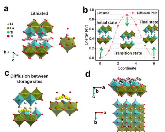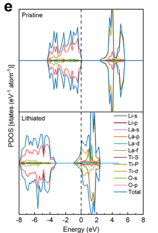 本研究通过共价键强度调控电压,提升锂离子电池能量密度,利用密度泛函理论计算分析 LiLaTiO₄中 Ti-O 键的共价性增强机制,包括 PJTE 畸变对轨道重叠的影响、锂离子扩散路径及能垒(最优路径能垒 0.89 eV)、电子结构(锂化后带隙消失转为金属态),并结合 XAS 和 XPS 验证锂存储时 Ti/La 的价态变化,阐明低电压与快速充电机理。