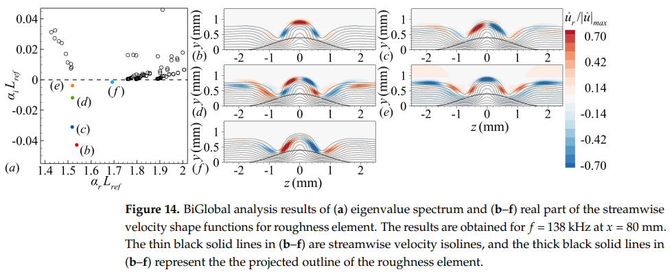 研究发现粗糙元诱导层流向湍流的转捩,粗糙元顶部分离的剪切层与反向旋转涡对之间的耦合作用引起了这一转捩,而粗糙带尾迹仅出现不稳定流并逐渐衰减。BiGlobal双全局稳定性分析表明尾迹区存在对称模态和反对称模态这两种不稳定模态,且对称模态在诱导粗糙元转捩中占据主导作用,而反对称在粗糙带尾迹中占据主导作用,说明对称模态在对促进转捩起到的积极作用。