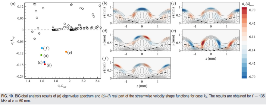 研究表明,正弦粗糙度模式在尾部产生两种反向旋转的流向涡对。较强的涡由两个涡对穿过最后一行正弦丘的侧面部分组成,较弱的涡由从正弦丘中心脱落的两个涡对形成。粗糙度高度较高的粗糙区域可以诱导层流完全转捩。进一步分析表明与侧向对旋涡对相关的对称模式占主导地位。在较低的粗糙度高度下,没有观察到转捩行为,每个涡对周围的低频反对称模式成为主导模式,并且表现出更低的增长率。